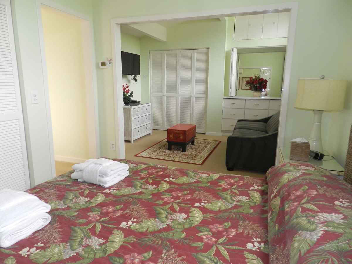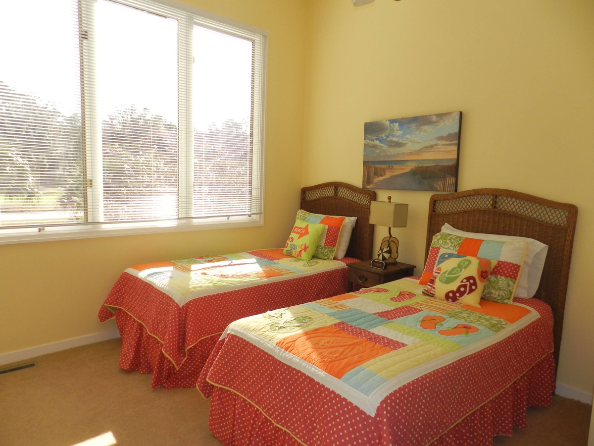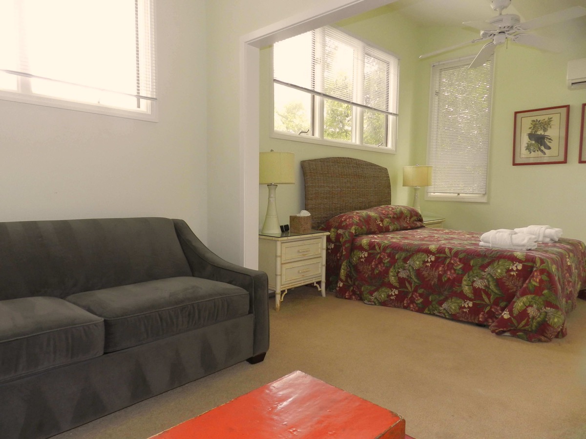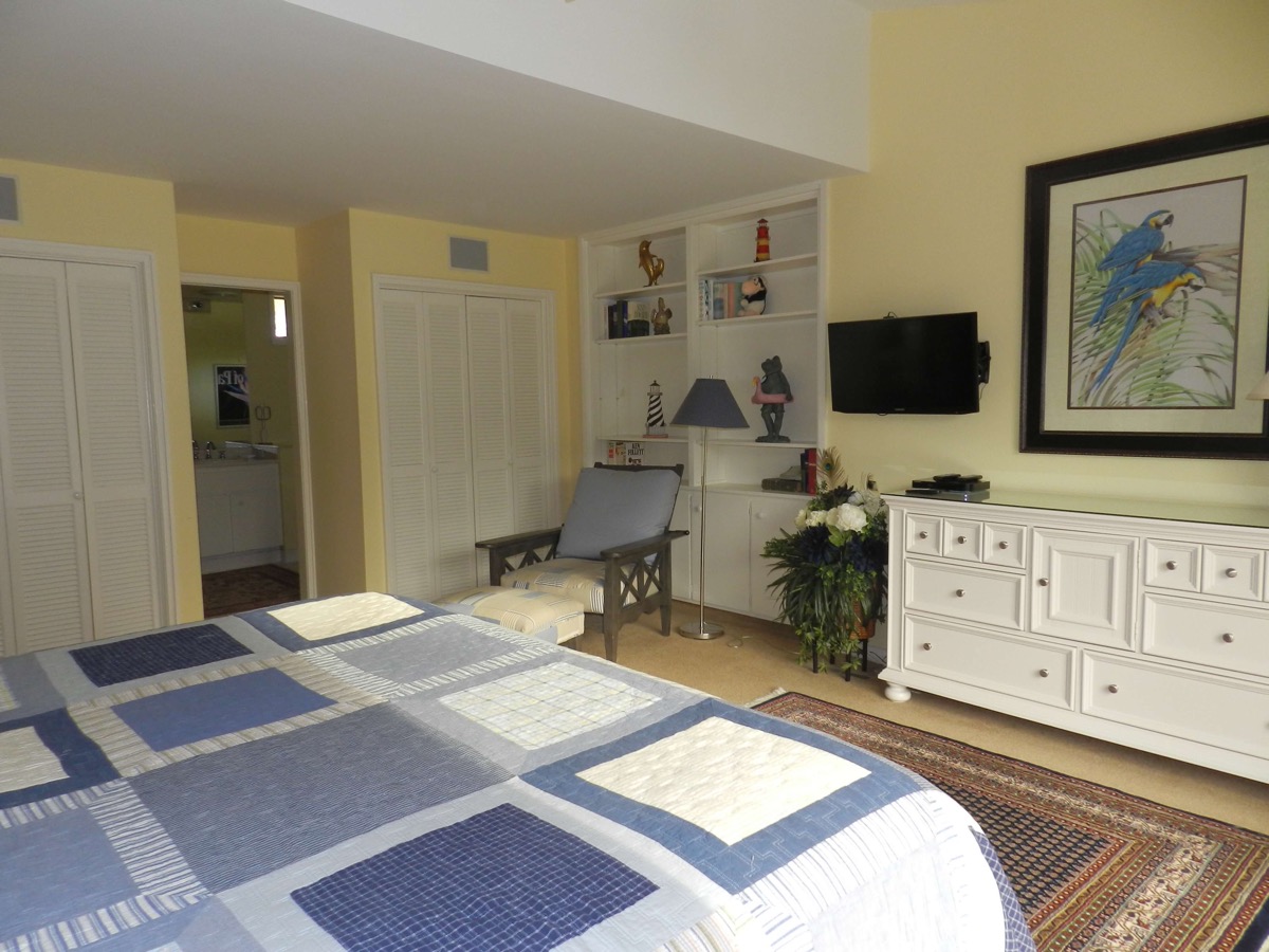 The other bedrooms, consist of the Flip Flop room, so named after the bedspread and lamp theme, and has two twin beds. The final bedroom has a queen sized bed and shares a bathroom with the twin bedroom. As well as having the normal air conditioning system in these bedrooms, we added Mitsubishi mini split units as well, thus allowing guests in each room, to individually control their choice of temperature to sleep in. The three bedrooms have their own TVs' & DVDs.