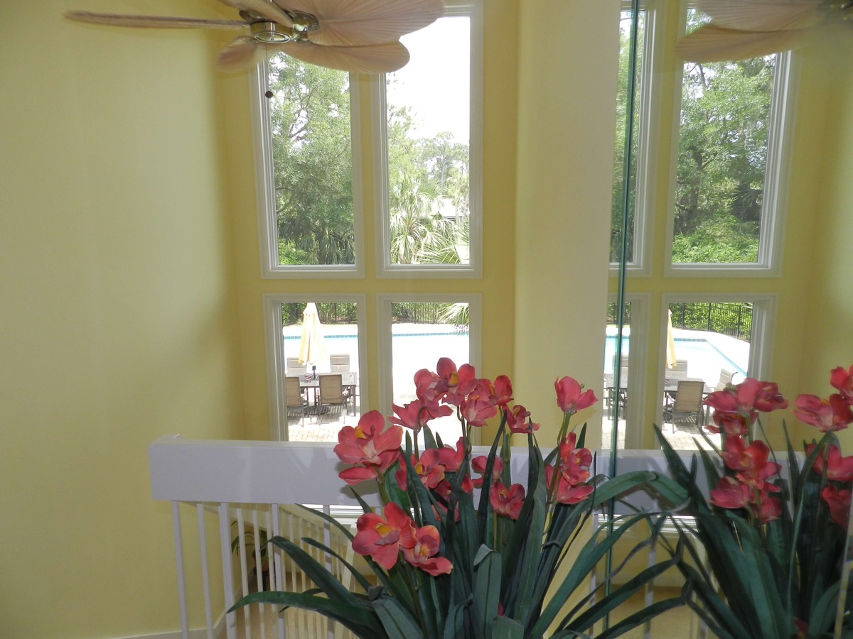 The living/dining room, downstairs Master bedroom, and the 3 upstairs bedrooms are all located on east side of the house, overlooking the pool and golf course.