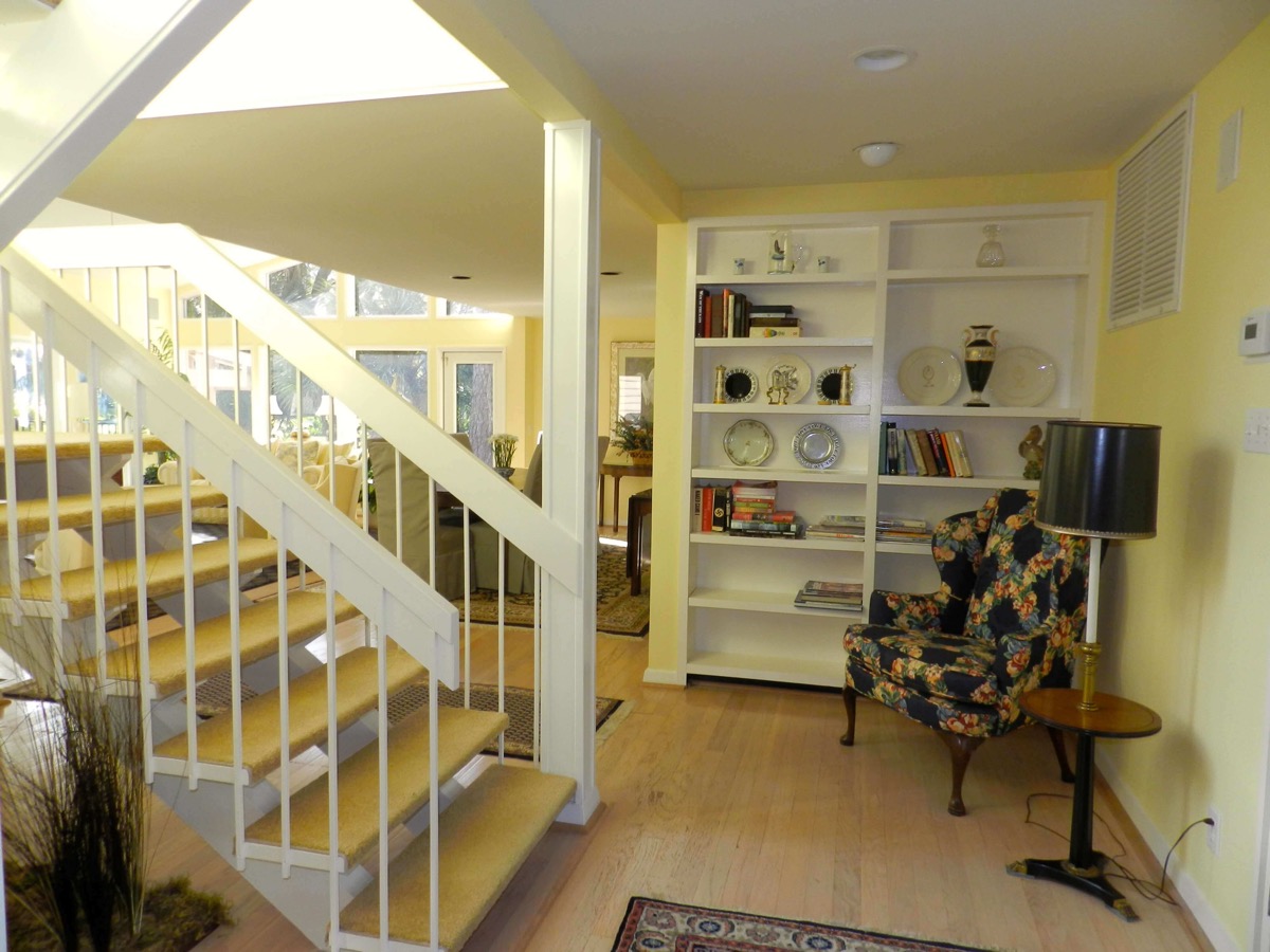 The entryway is lined with bookshelves on either side, and has an open stairway ahead with a dramatic two story window overlooking the pool, patio, golf course and green beyond.
