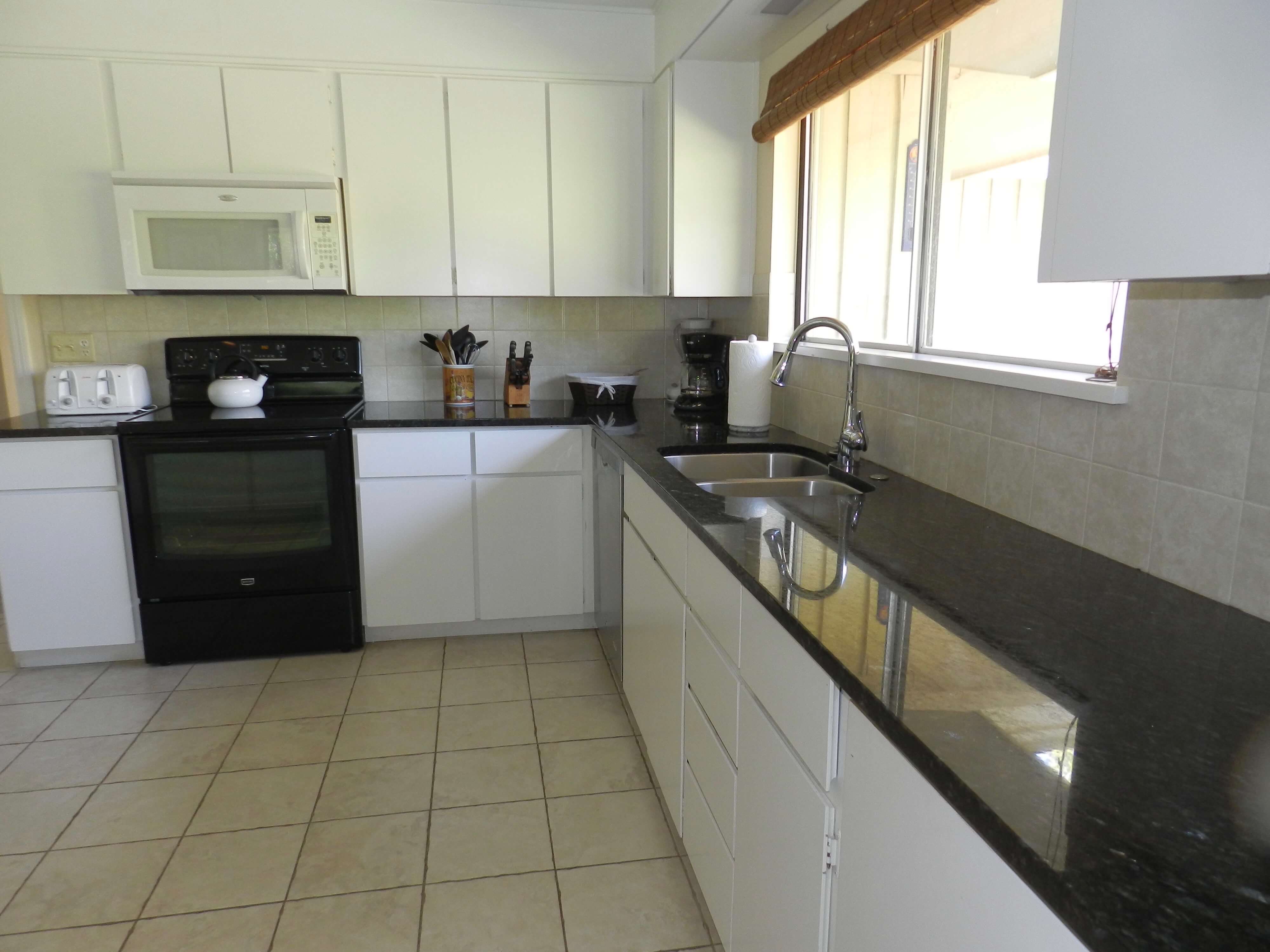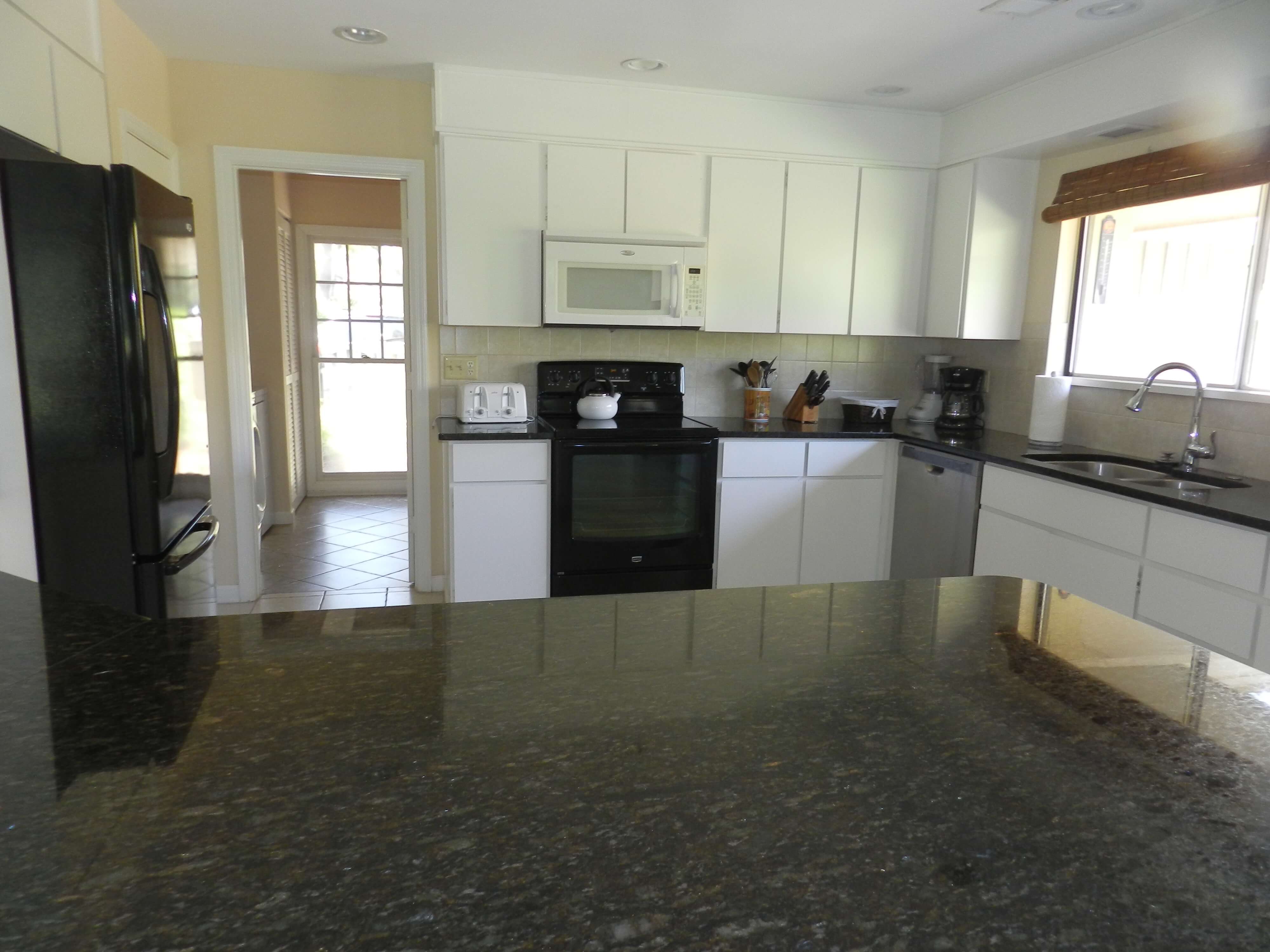 An open kitchen area, with granite countertops and counter seating for 4.